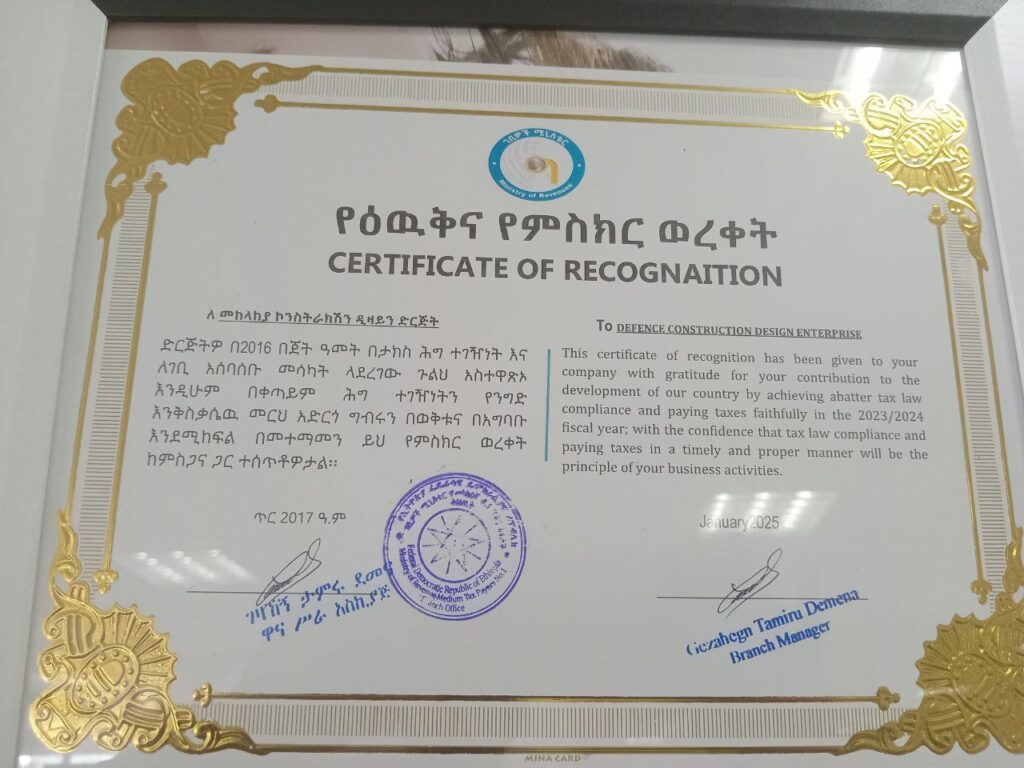 በ2016 በጀት አመት መከላከያ ኮንስትራክሽን ዲዛይን ድርጅት ግብሩን በወቅቱና በአግባቡ በመክፈል ለታክስ ገቢ አሰባሰብ ላበረከተው ከፍተኛ አስተዋፅኦ ታማኝ ግብር ከፋይ በመባል የ2ኛ ደረጃ የዕውቅና የምስክር ወረቀት ከገቢዎች ሚኒስቴር ተበረከተለት፡፡ በቦታው በመገኘት ሽልማቱን የተረከቡት የድርጅቱ ዋና ሥራ አሥፈፃሚ ኮ/ል ኢ/ር ፅጋቡ ገ/ማሪያም ናቸው፡፡ ሽልማቱ የአገር መከላከያ ሚኒስቴር አገር ከመጠበቅ ጎን ለጎን በኮንስትራክሽን ዘርፉ በርካታ ስራዎችን እየሰራ እንደሚገኝ ማሳያ መሆኑን ድርጅቱ አስመስክሯል፡፡